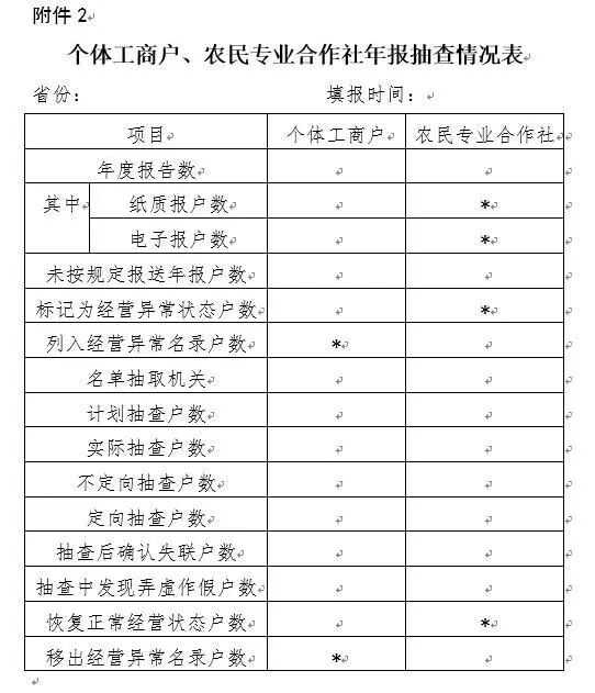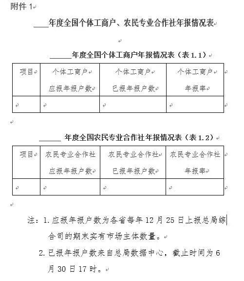 个体工商户、农民专业合作社 年报工作的通知 工商个字〔2018〕1号 各省、自治区、直辖市工商行政管理局、市场监督管理部门: 根据《个体工商户年度报告暂行办法》《农民专业合作社年度报告公示暂行办法》规定,2017年度个体工商户、农民专业合作社年报工作于2018年1月1日起开展。为切实做好个体工商户、农民专业合作社年报工作,现就有关事项通知如下: 一、进一步提高对年报工作的认识,强化工作部署 个体工商户、农民专业合作社依法向工商、市场监管部门报送年报,是经营者的法定义务,是其逐步积累社会信用的重要形式,是反映市场主体活跃度的重要依据,是工商、市场监管部门推进信用监管的重要载体。各地工商、市场监管部门要充分认识年报工作的重要作用,切实增强工作的使命感、责任感、紧迫感。面对新形势、新情况、新任务,强化工作部署,紧盯目标任务和时间节点,分时间、分阶段,积极采取有效措施,确保年报工作落到实处、取得实效。要向地方政府汇报好年报工作,主动争取政府支持。 二、继续扎实推进年报公示及抽查工作,逐步扩大个体工商户电子年报率 要通过多种方式,积极引导个体工商户通过公示系统进行年报公示,扩大电子年报的覆盖率。要在2017年工作基础上,继续做好个体工商户纸质年报电子化工作。工商所(市场监管所)收到个体工商户纸质年报后,应于10个工作日内完成电子化录入,并通过国家企业信用信息公示系统公示已年报。各省(区、市)工商和市场监管部门按照国家企业信用信息公示系统数据汇总要求,将电子化后的个体工商户年报数据实时上传工商总局。逐步实现纸质年报向电子年报的平稳过渡。 对已领取加载统一社会信用代码的营业执照的个体工商户、农民专业合作社,要将其年报数据向人力资源社会保障、统计部门等相关部门推送。在年报期结束后,要及时将未按规定时间报送年报的个体工商户标记为经营异常状态,农民专业合作社列入经营异常名录。 要认真做好个体工商户、农民专业合作社年报抽查组织工作,按照“双随机、一公开”原则,结合本地实际,确定合理的抽查比例,抽查结果要通过国家企业信用信息公示系统向社会公示。要加强对个体工商户、农民专业合作社年报工作的督导检查。 三、提升年报数据质量,积极探索对年报等信用信息的运用 要认真梳理年报易错数据项,修复完善公示系统的提示和校验功能,通过数值指标和业务逻辑控制等技术手段对异常数据进行提示,进一步提升年报数据质量。严肃年报工作纪律,坚持实事求是,不论是对查无下落、失联户、僵尸户,还是对正在经营中的市场主体,一律不得代报替报,不得随意增加或减少年报事项、擅自修改年报数据。对不再经营的个体工商户、农民专业合作社,要积极引导其自觉履行注销法定义务,依法退出市场,逐步还原真实的年报基数。 要发挥经营异常状态和经营异常名录信息的公示共享和信用约束作用,支持各地通过地方立法,加强对未年报个体工商户、农民专业合作社的失信惩戒,提高年报工作权威性和经营者报送年报的主动性和自觉性。多层面、多领域加强对个体工商户、农民专业合作社年报等信用信息的分析运用,辅助政府决策。 四、创新宣传教育,积极指导年报 要拓宽宣传渠道,扩大宣传范围,创新宣传方式,利用电视台、报纸、手机短信、门户网站,移动互联网和新媒体,如QQ群、微信群等一切可以利用的方式,大力宣传,使全体个体工商户和农民专业合作社了解年报工作的重要意义,知晓不参加年报的后果,积极履行年报义务。工商所(市场监管所)负责年报工作的工作人员,要充分发挥职能作用,履职尽责,积极指导经营者年报,不得出现因工作人员责任心不强、方法不当、办事效率不高而让申请人多次往返的现象。严禁在年报过程中搭车收费、乱收费。 请各省(区、市)工商和市场监管部门于2018年7月30日前将个体工商户、农民专业合作社年报工作总结(含附表1.2)报工商总局个体司。年报工作中遇到的问题及建议,特别是关于提升年报数据质量的建议,请随时报告。 工商总局将结合每年度的非公有制经济组织信用监管体系建设综治考评工作,组织开展督查。 附件:1. 年度全国个体工商户、农民专业合作社年报情况表 2.个体工商户、农民专业合作社年报抽查情况表 工商总局 2018年1月3日